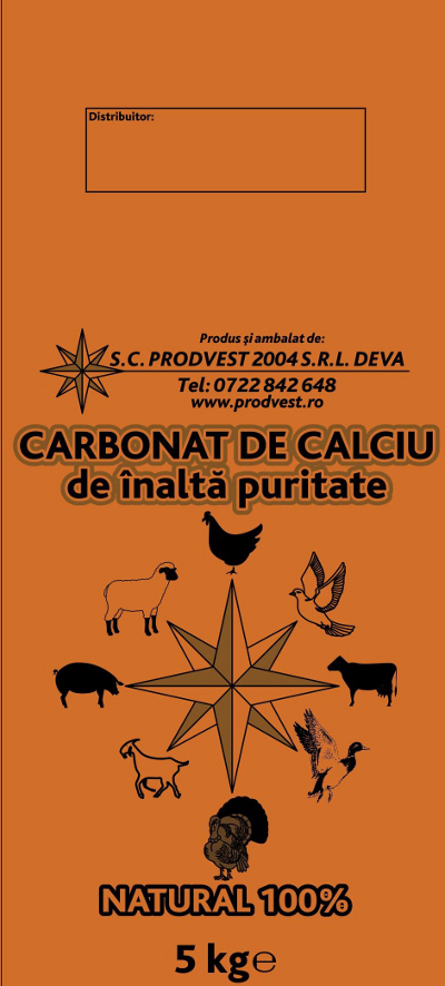 Producem si ambalam la sac de 50kg, 5kg, carbonat de calciu furajer in ambalajele si sub sigla clientului pentru comercializarea in farmacii veterinare si magazine de profil.